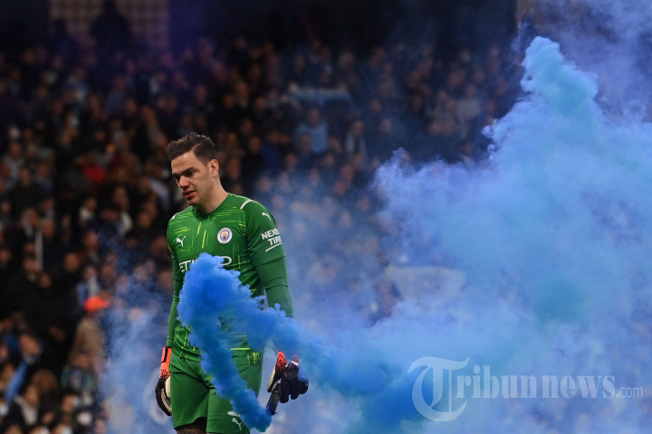 Penjaga gawang Manchester City asal Brasil, Ederson, menyingkirkan asap yang dilemparkan ke lapangan selama pertandingan sepak bola leg pertama semifinal Liga Champions UEFA antara Manchester City dan Real Madrid, di Stadion Etihad, di Manchester, pada 26 April 2022. (Photo by Paul ELLIS / AFP)
