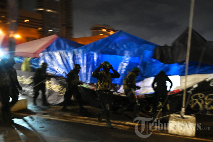 Anggota pasukan keamanan Sri Lanka bersiap untuk menghapus struktur sementara yang didirikan oleh pengunjuk rasa anti-pemerintah di lokasi kamp protes di depan Sekretariat Presiden di Kolombo pada 22 Juli 2022. - Ratusan tentara dan polisi Sri Lanka menggerebek markas anti -kamp protes pemerintah di ibu kota pada awal 22 Juli dan mulai merobohkan tenda-tenda aktivis yang tidak bersenjata, kata seorang wartawan AFP. (Photo by Arun SANKAR / AFP)