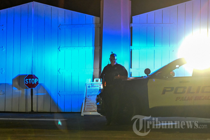 A police car is seen outside former US President Donald Trump's residence in Mar-A-Lago, Palm Beach, Florida on August 8, 2022. - Former US president Donald Trump said August 8, 2022 that his Mar-A-Lago residence in Florida was being raided by FBI agents in what he called an act of prosecutorial misconduct. (Photo by Giorgio VIERA / AFP)