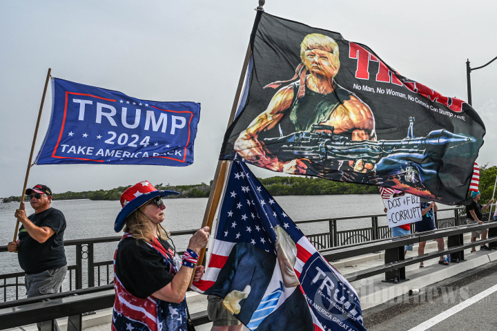 Pendukung mantan Presiden AS Donald Trump berkumpul di dekat kediamannya di Mar-A-Lago di Palm Beach, Florida, pada 9 Agustus 2022. - Mantan Presiden AS Donald Trump mengatakan pada 8 Agustus 2022, bahwa kediamannya di Mar-A-Lago di Florida sedang digerebek oleh agen FBI dalam apa yang disebutnya tindakan pelanggaran penuntutan. (Photo by Giorgio VIERA / AFP)