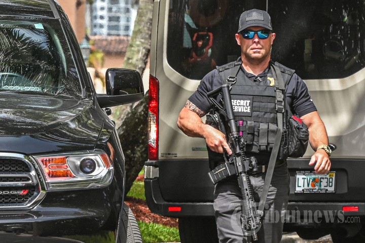 Seorang anggota Secret Service terlihat di depan rumah mantan Presiden Donald Trump di Mar-A-Lago di Palm Beach, Florida pada 9 Agustus 2022. - Mantan presiden AS Donald Trump mengatakan 8 Agustus 2022 bahwa Mar- Kediaman A-Lago di Florida digerebek oleh agen FBI dalam apa yang disebutnya sebagai tindakan pelanggaran kejaksaan. (Photo by Giorgio VIERA / AFP)