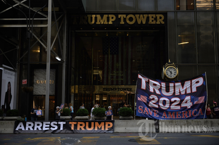 Spanduk bertuliskan Tangkap Trump dan Trump 2024 dipajang di luar gedung Trump Tower di New York City pada 9 Agustus 2022. - Mantan presiden AS Donald Trump mengatakan pada 8 Agustus 2022, bahwa kediamannya di Mar-A-Lago di Florida sedang dibangun. digerebek oleh agen FBI dalam apa yang disebutnya sebagai tindakan pelanggaran kejaksaan. (Photo by Ed JONES / AFP)
