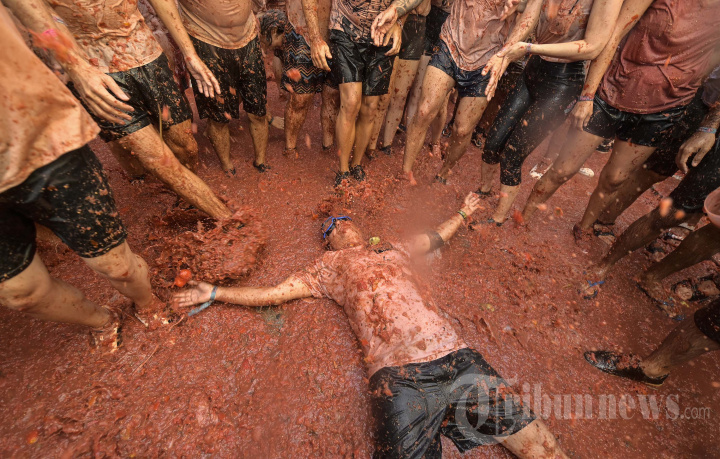 Sebuah pesta pora terletak di jalan yang dibanjiri tomat yang dihancurkan selama festival Tomatina tahunan di kota timur Bunol, pada 31 Agustus 2022. - Pesta ikonik, yang disebut sebagai pertarungan makanan terbesar di dunia telah menjadi daya tarik utama bagi orang asing, khususnya dari Inggris, Jepang dan Amerika Serikat. (Photo by JOSE JORDAN / AFP)