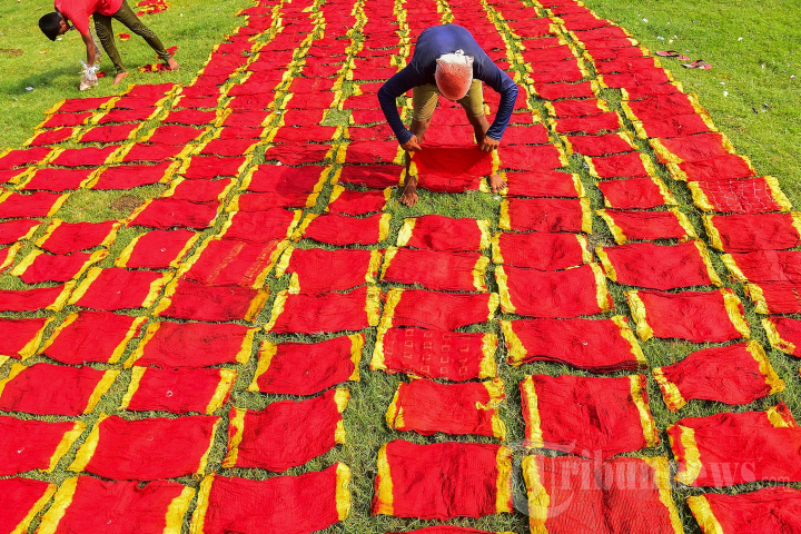 Pekerja meletakkan kain Chunri untuk dijemur, yang digunakan dalam ritual Hindu, menjelang festival Navratri di desa Lalgopalganj sekitar 45 km dari Allahabad pada 23 September 2022. (Photo by SANJAY KANOJIA / AFP)