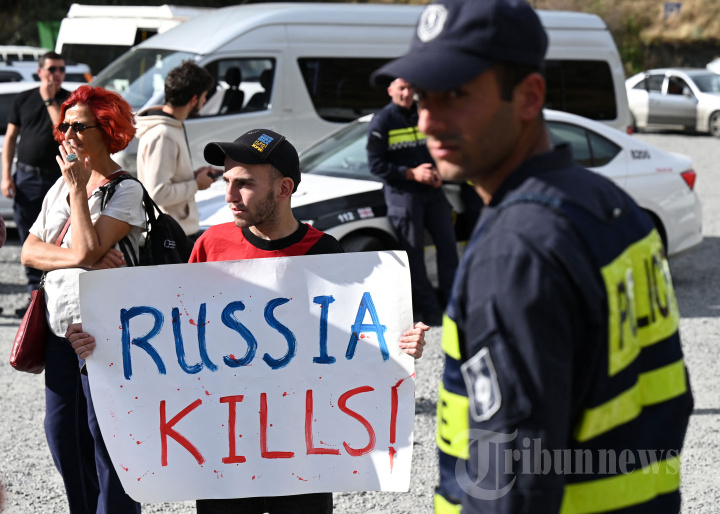 Aktivis Georgia memprotes imigrasi massal dari Rusia di titik persimpangan perbatasan Kazbegi / Verkhniy Lars antara kedua negara pada 28 September 2022. - Gelombang terbaru pengasingan Rusia sejak konflik dimulai pada Februari telah melihat pria usia militer mengalir ke Kaukasus negara, dengan mobil dalam kolom yang membentang sekitar 20 kilometer, dengan sepeda dan beberapa kilometer berjalan kaki ke penyeberangan perbatasan. (Photo by Vano SHLAMOV / AFP)