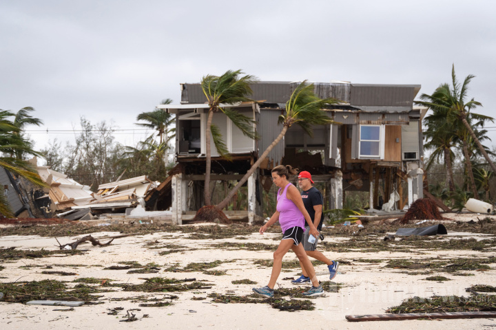 Orang-orang berjalan di sepanjang pantai melihat properti yang rusak akibat Badai Ian pada 29 September 2022 di Bonita Springs, Florida. Badai membuat pendaratan AS di Cayo Costa, Florida, dan membawa angin kencang, gelombang badai, dan hujan ke daerah yang menyebabkan kerusakan parah. (Photo by Sean Rayford / GETTY IMAGES NORTH AMERICA / Getty Images via AFP)