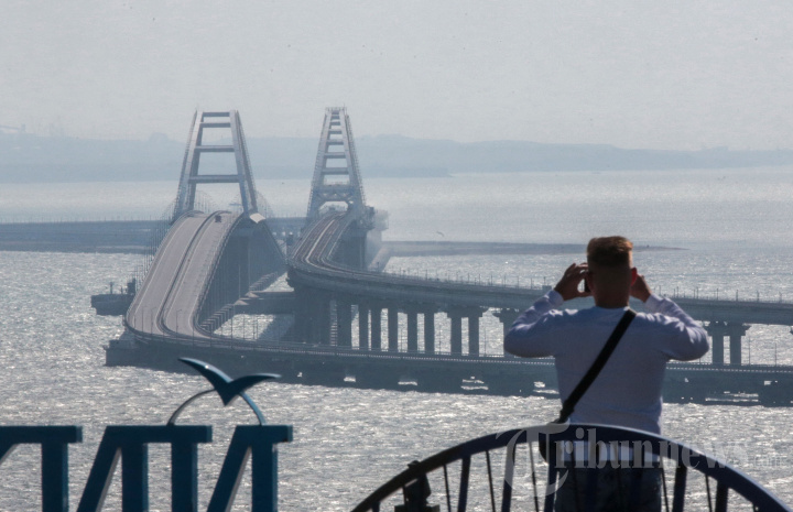 Sebuah foto yang diambil pada 8 Oktober 2022 menunjukkan seorang pria mengambil gambar jembatan yang menghubungkan Krimea ke Rusia setelah sebuah truk meledak di jembatan pagi ini di Kerch. - Moskow mengumumkan pada 8 Oktober 2022 bahwa sebuah truk meledak memicu kebakaran besar dan merusak jembatan utama Kerch -- yang dibangun sebagai satu-satunya penghubung darat Rusia dengan Krimea yang dicaplok -- dan berjanji akan menemukan pelakunya, tanpa segera menyalahkan Ukraina. (Photo by AFP)