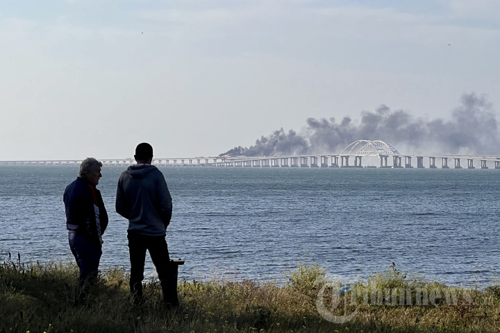 Orang-orang melihat asap hitam tebal membubung dari kebakaran di jembatan Kerch yang menghubungkan Krimea ke Rusia, setelah sebuah truk meledak, dekat Kerch, pada 8 Oktober 2022. - Moskow mengumumkan pada 8 Oktober 2022 bahwa sebuah truk meledak memicu kebakaran besar dan merusak jembatan kunci Kerch -- yang dibangun sebagai satu-satunya jalur darat Rusia dengan Krimea yang dicaplok -- dan berjanji akan menemukan pelakunya, tanpa segera menyalahkan Ukraina. (Photo by Roman DMITRIYEV / AFP)