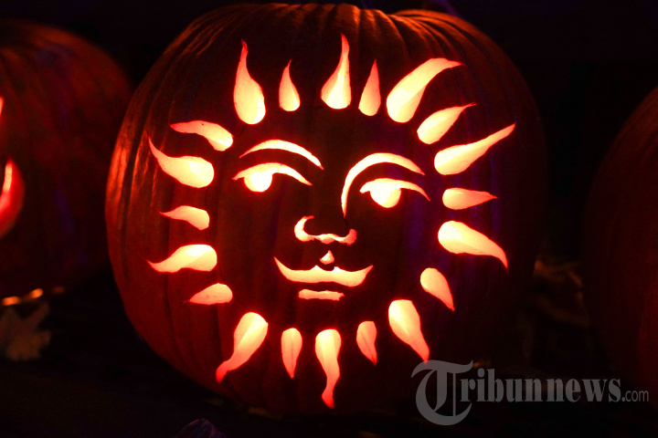 Sebuah labu yang diukir dengan bentuk matahari ditampilkan di Great Jack O Lantern Blaze, di mana ribuan labu ukiran tangan ditampilkan, di Van Cortlandt Manor pada 8 Oktober 2022 di Croton-on-Hudson, menjelang Halloween.