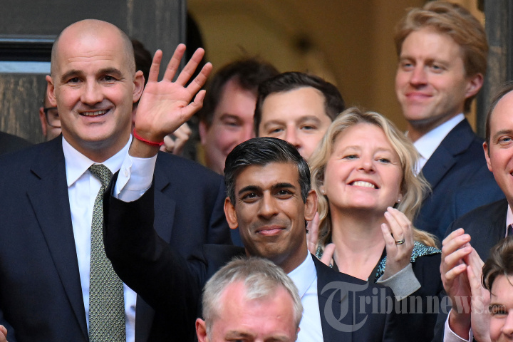 Pemimpin Partai Konservatif baru dan perdana menteri yang akan datang Rishi Sunak (tengah) melambai ketika ia tiba di Markas Besar Partai Konservatif di pusat kota London telah diumumkan sebagai pemenang kontes kepemimpinan Partai Konservatif, pada 24 Oktober 2022. - Perdana menteri Inggris berikutnya, mantan kepala keuangan Rishi Sunak, mewarisi ekonomi Inggris yang menuju resesi bahkan sebelum gejolak baru-baru ini dipicu oleh Liz Truss. (Photo by Daniel LEAL / AFP)