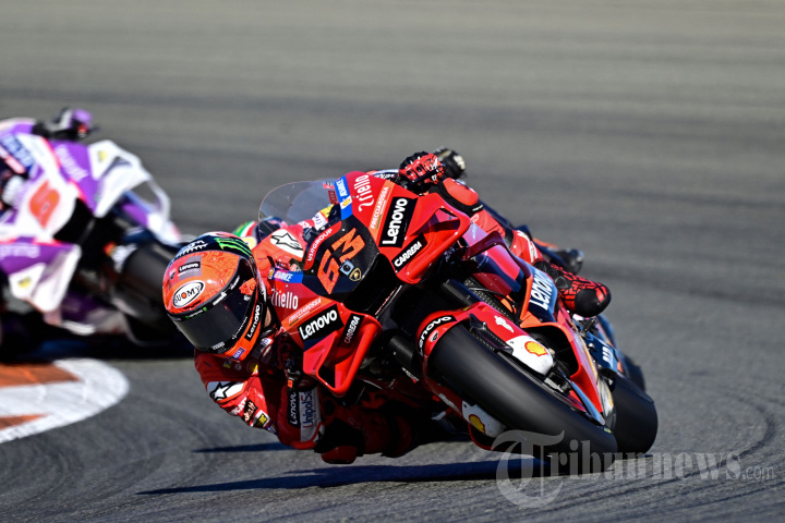 Pebalap Italia Francesco Bagnaia berkompetisi selama balapan Grand Prix MotoGP Valencia di arena pacuan kuda Ricardo Tormo di Cheste, dekat Valencia, pada 6 November 2022. (Photo by JAVIER SORIANO / AFP)