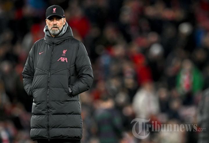 Manajer Liverpool asal Jerman Jurgen Klopp bereaksi saat para pemain melakukan pemanasan menjelang pertandingan sepak bola leg pertama babak 16 besar Liga Champions UEFA antara Liverpool dan Real Madrid di Anfield di Liverpool, barat laut Inggris pada 21 Februari 2023.