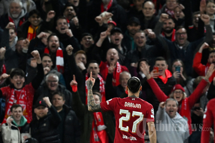 Penyerang Liverpool asal Uruguay, Darwin Nunez, merayakan gol pembuka pada pertandingan sepak bola leg pertama babak 16 besar Liga Champions UEFA antara Liverpool dan Real Madrid di Anfield di Liverpool, barat laut Inggris pada 21 Februari 2023. (Photo by Paul ELLIS / AFP)