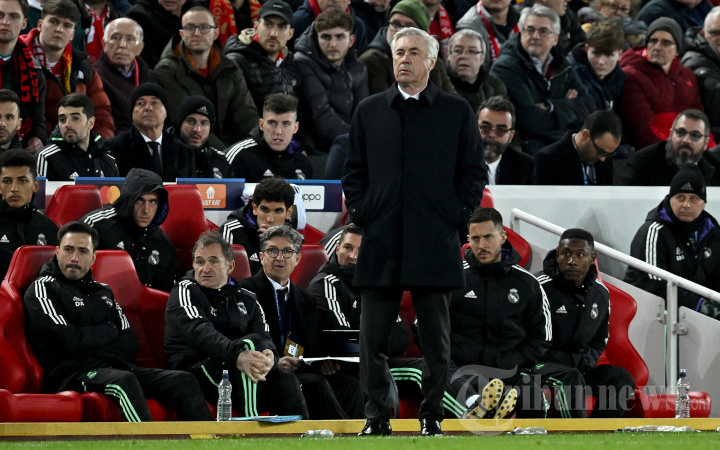 Pelatih Real Madrid asal Italia Carlo Ancelotti menyaksikan para pemain dari pinggir lapangan selama pertandingan sepak bola leg pertama babak 16 besar Liga Champions UEFA antara Liverpool dan Real Madrid di Anfield di Liverpool, barat laut Inggris pada 21 Februari 2023.