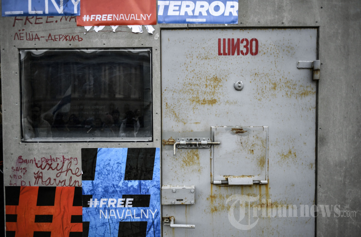 Poster-poster menentang Presiden Rusia Vladimir Putin menghiasi maket sel hukuman politisi oposisi Rusia Alexei Navalny yang dipenjara pada 14 Maret 2023 di Paris. - Selama dua tahun terakhir, Alexei Navalny yang berusia 46 tahun telah ditahan di luar Vladimir, sebuah kota sekitar 230 kilometer (145 mil) timur Moskow setelah hukuman penggelapan, salah satu dari beberapa keputusan yang dikecam Navalny sebagai upaya untuk membungkamnya . Instalasi diatur oleh inisiatif FreeNavalny dan StopPutin. Sebuah deklarasi di sel berbunyi: "Tempatkan diri Anda pada posisi Alexei Navalny - Masuklah ke dalam dan rasakan sejenak bagaimana rasanya menjadi musuh utama Putin di Rusia - politisi oposisi Alexei Navalny, yang saat ini dipenjara karena dibuat-buat. kasus Ini adalah sel hukuman (SHIZO) tempat Navalny menghabiskan 91 hari pada tahun 2022". "Penulis instalasi ini adalah Oleg Navalny, saudara laki-laki Alexei". (Photo by STEPHANE DE SAKUTIN / AFP)