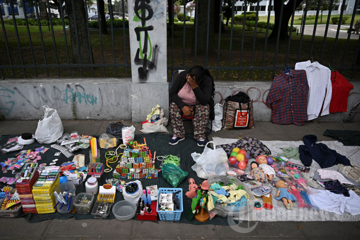 Seorang wanita menjual barang-barang di jalan di Buenos Aires pada 12 Januari 2023. - Argentina mencatat inflasi 94,8 persen pada 2022, angka tahunan tertinggi sejak 1991, kata lembaga statistik nasional Indec, Kamis. (Photo by Luis ROBAYO / AFP)