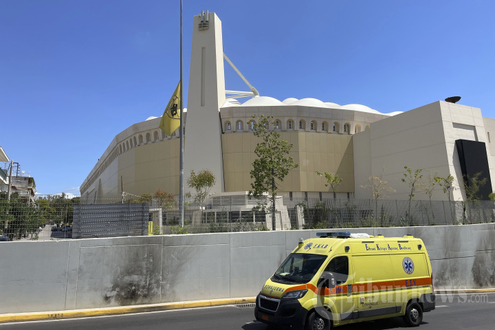 Bendera tim AEK Athens dikibarkan setengah tiang di luar OPAP Arena saat ambulans melintas, menyusul bentrokan semalam antara suporter rival di pinggiran Nea Philadelphia, di Athena, Yunani, Selasa, 8 Agustus 2023. Badan sepak bola Eropa UEFA mengatakan telah menunda pertandingan kualifikasi Liga Champions antara AEK Athens dan Kroasia Dinamo Zagreb dijadwalkan Selasa karena kekerasan. Delapan suporter terluka sementara polisi Yunani mengatakan pada Selasa bahwa mereka telah menangkap 88 orang, sebagian besar suporter Kroasia. (AP Photo/Thanassis Stavrakis)