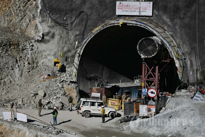 Pemandangan umum menunjukkan pintu masuk terowongan jalan Silkyara yang sedang dibangun saat upaya penyelamatan pekerja konstruksi yang terjebak beberapa hari setelah bagian terowongan runtuh di distrik Uttarkashi di negara bagian Uttarakhand, India pada 22 November 2023. Empat puluh satu pekerja India terjebak di dalam terowongan jalan Silkyara yang sedang dibangun. terowongan jalan yang runtuh selama 10 hari terlihat hidup di kamera untuk pertama kalinya pada tanggal 21 November ketika para pekerja berusaha membuat jalan baru untuk membebaskan mereka. (Photo by Arun SANKAR / AFP)