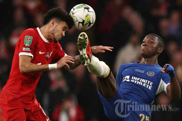 Gelandang Liverpool Kolombia #07 Luis Diaz (Kiri) bersaing dengan gelandang Chelsea Ekuador #25 Moises Caicedo (kanan) pada pertandingan sepak bola final Piala Liga Inggris antara Chelsea dan Liverpool di stadion Wembley, di London, pada 25 Februari 2024. (Photo by Adrian DENNIS / AFP)