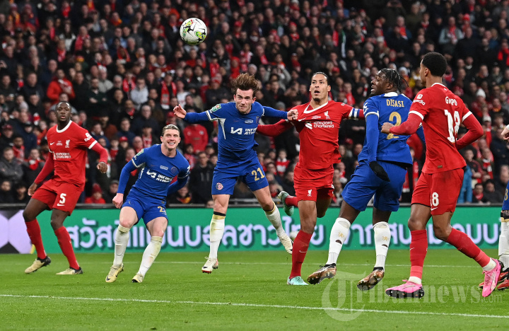 Bek Liverpool asal Belanda #04 Virgil van Dijk mencetak gol tetapi gol tersebut dianulir setelah tinjauan VAR, selama pertandingan sepak bola final Piala Liga Inggris antara Chelsea dan Liverpool di stadion Wembley, di London, pada 25 Februari 2024. (Photo by Glyn KIRK / AFP)