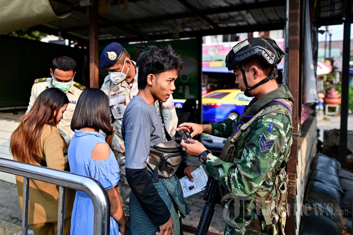 Seorang personel militer Thailand (kanan) memeriksa tas seorang warga negara Myanmar setelah ia menyeberang ke Thailand, di pos pemeriksaan perbatasan Tak di distrik Mae Sot Thailand pada 11 April 2024. - Pasukan junta Myanmar telah mundur dari pusat perdagangan utama dekat Perbatasan Thailand setelah bentrokan selama berhari-hari, kata sebuah kelompok etnis bersenjata kepada AFP pada 11 April 2024, memberikan pukulan lebih lanjut terhadap militer yang berperang. (Photo by MANAN VATSYAYANA / AFP)
