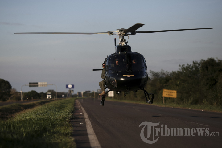 Sebuah helikopter yang digunakan oleh tim penyelamat mendarat di tengah jalan raya BR-116 di Eldorado do Sul, Rio Grande do Sul, Brasil pada 9 Mei 2024. - Tim berpacu dengan waktu pada hari Kamis untuk mengirimkan bantuan kepada komunitas yang dilanda banjir di selatan Brazil sebelum datangnya badai baru diperkirakan akan kembali menghantam wilayah tersebut. Sekitar 400 kota terkena dampak bencana alam terburuk yang pernah melanda negara bagian Rio Grande do Sul, dengan sedikitnya 107 orang tewas dan ratusan lainnya luka-luka. (Photo by Anselmo CUNHA / AFP)