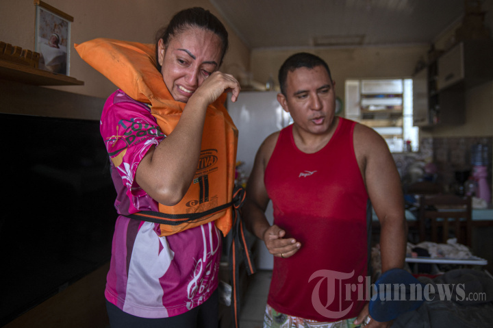 Katiane Mello (Kiri) dan suaminya James Vargas menangis sebelum meninggalkan rumah mereka di Eldorado do Sul, negara bagian Rio Grande do Sul, Brasil, pada 9 Mei 2024. Tim berpacu dengan waktu pada hari Kamis untuk mengirimkan bantuan kepada komunitas yang dilanda banjir di bagian selatan Brazil sebelum datangnya badai baru diperkirakan akan kembali menghantam wilayah tersebut. Sekitar 400 kota terkena dampak bencana alam terburuk yang pernah melanda negara bagian Rio Grande do Sul, dengan sedikitnya 107 orang tewas dan ratusan lainnya luka-luka. (Photo by Carlos FABAL / AFP)