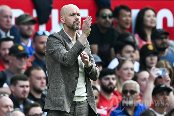Manajer Manchester United asal Belanda Erik ten Hag memberikan instruksi kepada para pemain dari tepi lapangan selama pertandingan sepak bola Liga Utama Inggris antara Manchester United dan Arsenal di Old Trafford di Manchester, barat laut Inggris, pada 12 Mei 2024. (Photo by Paul ELLIS / AFP)