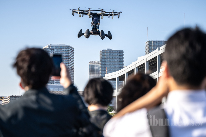 Operator penerbangan mengendalikan mobil terbang HEXA yang dikembangkan oleh LIFT Aircraft Inc di Tokyo Big Sight di Tokyo pada 17 Mei 2024. (Photo by Philip FONG / AFP)