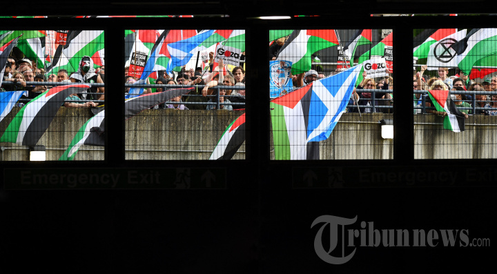 Pendukung pro-Palestina mengibarkan bendera Palestina saat mereka berdemonstrasi di luar stadion Hampden Park, di Glasgow, Skotlandia, pada 31 Mei 2024 sebelum pertandingan sepak bola kualifikasi Grup 2 Liga B Wanita UEFA 2025 antara Skotlandia dan Israel. (Photo by ANDY BUCHANAN / AFP)