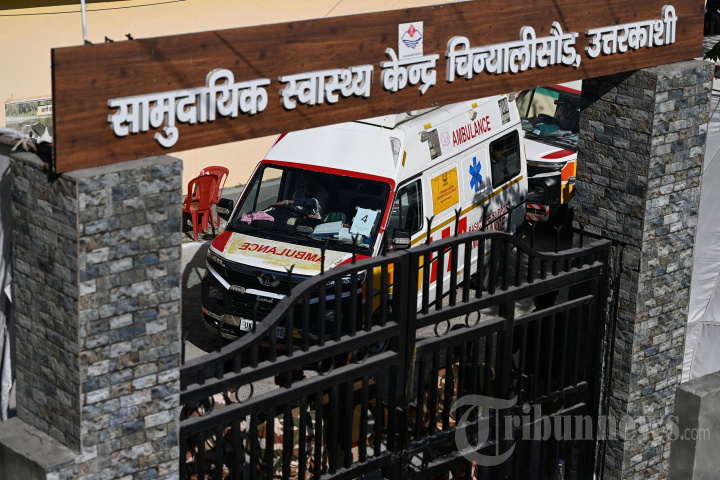 Sebuah ambulans terlihat diparkir di dalam pusat kesehatan masyarakat tempat para pekerja yang diselamatkan menerima perawatan medis di Chinyalisaur di distrik Uttarakashi di Negara Bagian Uttarakhand pada tanggal 29 November 2023, sehari setelah tim penyelamat dengan aman mengeluarkan semua pekerja dari terowongan jalan Himalaya Silkyara yang runtuh. Para pekerja India disambut dengan sorak-sorai liar dan karangan bunga pada tanggal 28 November ketika tim penyelamat dengan selamat mengeluarkan 41 orang dari terowongan jalan Himalaya yang runtuh tempat mereka terjebak setelah operasi rekayasa maraton selama 17 hari. (Photo by Sajjad HUSSAIN / AFP)