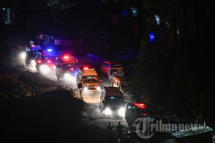 Ambulans yang membawa pekerja yang diselamatkan berangkat setelah tim darurat dan penyelamat dengan aman mengeluarkan semua pekerja yang terperangkap dari terowongan Silkyara yang runtuh di distrik Uttarkashi di negara bagian Uttarakhand, India pada 28 November 2023. Tim penyelamat India telah dengan aman mengeluarkan 41 pekerja dari terowongan jalan Himalaya yang runtuh setelah operasi rekayasa maraton selama 17 hari untuk membebaskan mereka, kata seorang menteri pada 28 November. (Photo by Sajjad HUSSAIN / AFP)