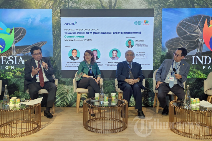 Direktur Utama PT Riau Andalan Pulp and Paper (RAPP), unit operasional APRIL Group Sihol Aritonang (kiri) berkesempatan memaparkan langkah-langkah yang dilakukan produsen pulp dan kertas tersebut dalam mendukung tercapainya Indonesia FOLU Net Sink 2030, dalam gelaran Konferensi Perubahan Iklim COP28 di Dubai, Senin (5/12/2023). Dalam sesi Towards 2030 Sustainable Forest Management Commitments di Paviliun Indonesia, Sihol mengatakan upaya tersebut juga sejalan untuk mendukung target Net Zero Emmision pada 2060. TRIBUNNEWS/Dok. APRIL