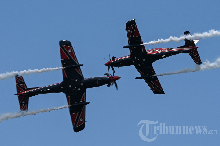 Pesawat Pilatus PC-21 dari tim aerobatik Royal Australian Air Force, yang dikenal sebagai Roulettes, tampil pada Singapore Airshow di Singapura pada 20 Februari 2024. (Photo by Roslan RAHMAN / AFP)