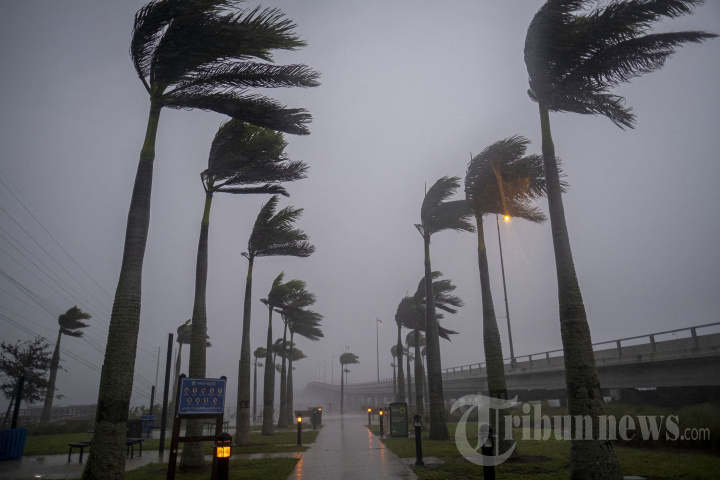 Angin bertiup pohon palem menjelang Badai Ian di Charlotte Harbor, Florida, pada 28 September 2022. - Ian meningkat hingga hanya sedikit dari kekuatan Kategori 5 bencana Rabu ketika angin kencang mulai menerjang Florida, dengan peramal memperingatkan gelombang badai yang mengancam jiwa setelah meninggalkan jutaan orang tanpa listrik di Kuba. (Photo by Ricardo ARDUENGO / AFP)