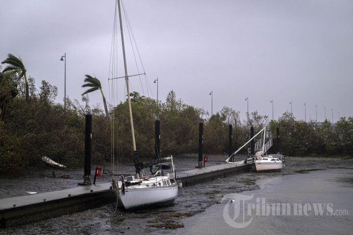 Perahu layar terletak di dasar Charlotte Harbour selama surut saat mata Badai Ian lewat di Punta Gorda, Florida pada 28 September 2022. - Badai Ian menghantam Florida 28 September 2022, dengan Pusat Badai Nasional mengatakan mata badai mendarat pada pukul 1905 GMT saat angin kencang dan hujan lebat menerjang pantai. (Photo by Ricardo ARDUENGO / AFP)