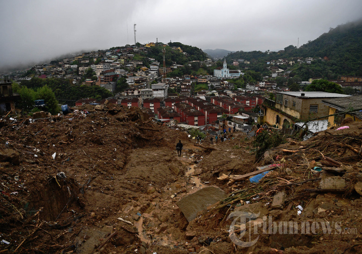 Pemandangan setelah tanah longsor di Petropolis, Brasil pada 16 Februari 2022. - Banjir skala besar menghancurkan ratusan properti dan merenggut sedikitnya 34 nyawa di daerah tersebut. (Photo by CARL DE SOUZA / AFP)