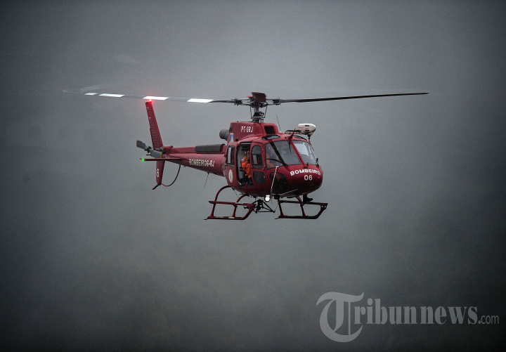 Tim penyelamat pemadam kebakaran dengan helikopter mencari korban selamat dari tanah longsor di Petropolis, Brasil pada 16 Februari 2022. Banjir skala besar menghancurkan ratusan properti dan merenggut sedikitnya 34 nyawa di daerah tersebut. (Photo by CARL DE SOUZA / AFP)