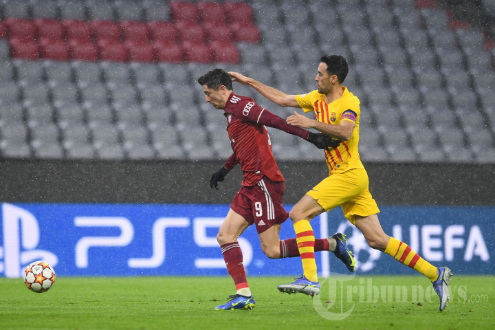 Pemain depan Bayern Munich Polandia Robert Lewandowski (kiri) dan pemain tengah Barcelona Spanyol Sergio Busquets bersaing memperebutkan bola selama pertandingan sepak bola grup E Liga Champions FC Bayern Munich v FC Barcelona di Munich, Jerman selatan pada 8 Desember 2021. (Photo by Christof STACHE / AFP)