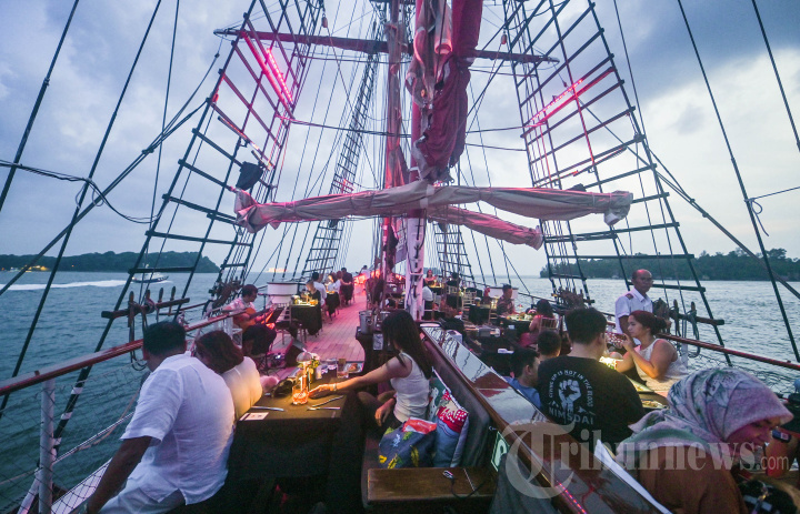 Dalam foto yang diambil pada 13 Agustus 2023 ini, pengunjung menikmati makan malam di Royal Albatross, kapal tinggi mewah yang menyelenggarakan pengalaman berlayar dan bersantap di sekitar perairan Singapura dengan hewan peliharaan diperbolehkan. Pemilik kucing di Singapura sekarang dapat membawa hewan peliharaannya ke kapal pesiar matahari terbenam yang mewah, cocok untuk anak kucing yang dimanjakan yang menikmati hal-hal yang lebih baik dalam hidup. (Photo by Roslan RAHMAN / AFP)