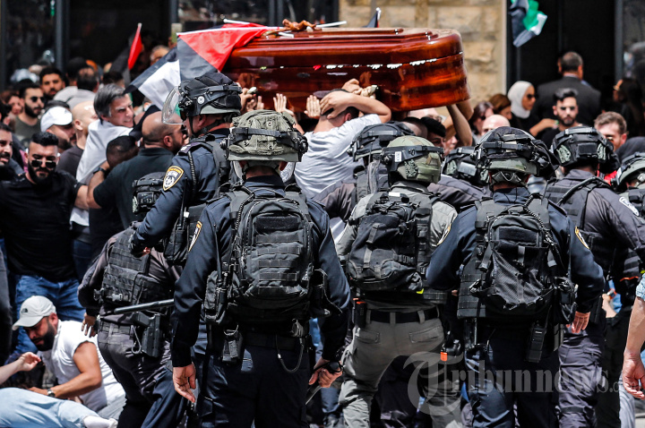Kekerasan meletus antara pasukan keamanan Israel dan pelayat Palestina yang membawa peti mati jurnalis Al-Jazeera yang terbunuh Shireen Abu Akleh keluar dari rumah sakit, sebelum diangkut ke sebuah gereja dan kemudian tempat peristirahatannya, di Yerusalem, pada 13 Mei 2022. - Abu Akleh , yang ditembak mati pada 11 Mei 2022 saat meliput serangan di Tepi Barat yang diduduki Israel, termasuk di antara tokoh media Arab yang paling menonjol dan dipuji secara luas karena keberanian dan profesionalismenya.