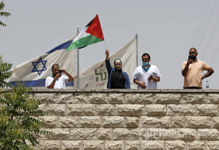 Seorang wanita Palestina mengibarkan bendera nasional di atap sebuah gedung tempat bendera Israel ditempatkan, di seberang rumah sakit tempat mayat jurnalis Al-Jazeera Shireen Abu Akleh disimpan, beberapa jam sebelum pemakamannya di Yerusalem, pada 13 Mei , 2022. - Abu Akleh, yang ditembak mati pada 11 Mei 2022 saat meliput serangan di Tepi Barat yang diduduki Israel, termasuk di antara tokoh media Arab yang paling menonjol dan dipuji secara luas karena keberanian dan profesionalismenya.