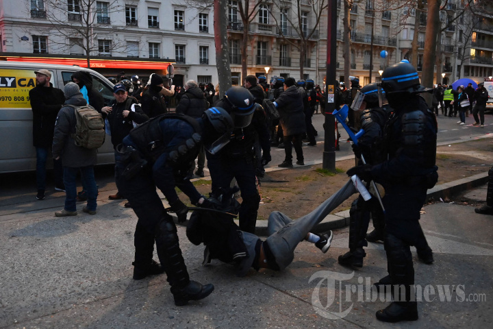 Polisi menahan seorang pengunjuk rasa selama rapat umum pada hari kedua pemogokan dan protes nasional atas usulan reformasi pensiun pemerintah, di Paris pada 31 Januari 2023. - Prancis bersiap untuk penyumbatan transportasi besar, dengan pemogokan massal dan protes akan melanda negara itu selama kedua kalinya dalam satu bulan keberatan dengan rencana peningkatan usia pensiun dari 62 menjadi 64. Pada 19 Januari, sekitar 1,1 juta menyuarakan penentangan mereka terhadap usulan perombakan -- protes terbesar sejak putaran besar terakhir pensiun reformasi tahun 2010. (Photo by Alain JOCARD / AFP)