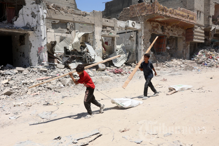 Anak-anak lelaki Palestina mengumpulkan kayu bakar untuk memasak saat mereka berjalan melewati puing-puing yang kotor, melewati bangunan-bangunan yang hancur setelah militer Israel mundur setelah serangan dua minggu dari lingkungan Shujaiya, sebelah timur Kota Gaza pada 11 Juli 2024, di tengah serangan yang sedang berlangsung. konflik antara Israel dan kelompok militan Hamas. - Badan pertahanan sipil di Gaza yang dikuasai Hamas mengatakan pada 11 Juli, bahwa sekitar 60 mayat telah ditemukan di distrik Shujaiya Kota Gaza, yang hancur akibat serangan Israel selama dua minggu. Israel pada Rabu mengatakan pihaknya telah mengakhiri operasinya terhadap militan Hamas di distrik tersebut. (Photo by Omar AL-QATTAA / AFP)