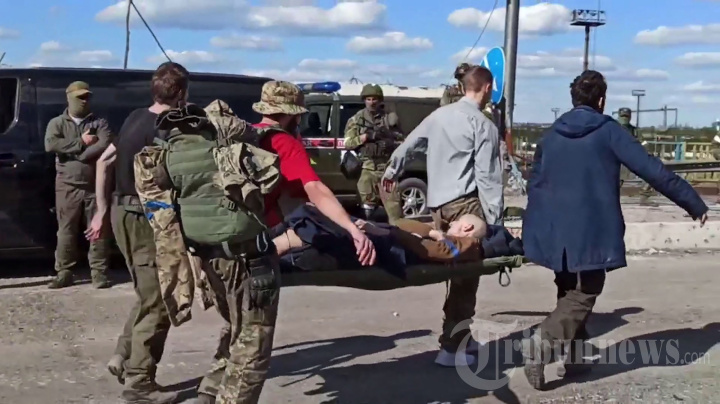 Tangkapan layar ini diperoleh dari video selebaran yang dirilis oleh Kementerian Pertahanan Rusia pada 17 Mei 2022, menunjukkan seorang anggota layanan Ukraina yang dibawa dengan tandu dikawal oleh personel militer pro-Rusia setelah meninggalkan pabrik baja Azovstal yang terkepung di kota pelabuhan Mariupol, Ukraina. (Photo by Handout / Russian Defence Ministry / AFP)