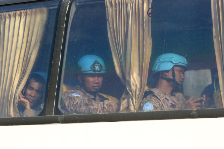 Anggota pasukan penjaga perdamaian UNIFIL duduk di dalam bus di lokasi serangan Israel di pintu masuk utara kota selatan Sidon, pada 7 November 2024, di tengah perang yang sedang berlangsung antara Israel dan Hizbullah. - Pasukan penjaga perdamaian PBB di Lebanon terluka pada 7 November, dalam serangan Israel di dekat kendaraan mereka di pintu masuk kota selatan Sidon, kata Kantor Berita Nasional resmi. (Photo by Mahmoud ZAYYAT / AFP)