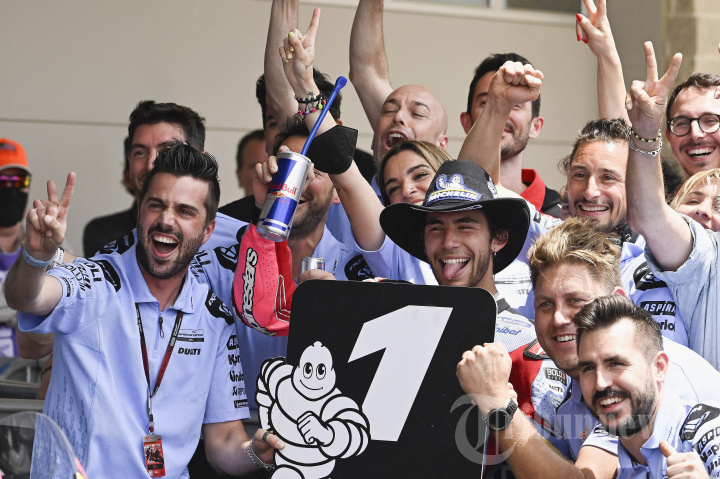Enea Bastianini dari MotoGP Italia dan Gresini Racing merayakan kemenangan bersama tim di bawah podium di akhir balapan MotoGP selama MotoGP Of The Americas - Race pada 10 April 2022 di Austin, Texas. Mirco Lazzari gp/Getty Images/AFP (Photo by Mirco Lazzari gp / GETTY IMAGES NORTH AMERICA / Getty Images via AFP)