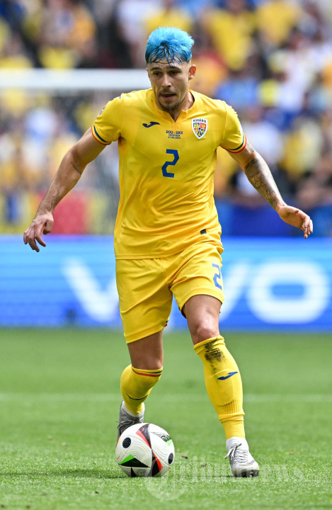 Bek Rumania #02 Andrei Ratiu mengontrol bola selama pertandingan sepak bola Grup E UEFA Euro 2024 antara Rumania dan Ukraina di Munich Football Arena di Munich pada 17 Juni 2024. (MIGUEL MEDINA / AFP)