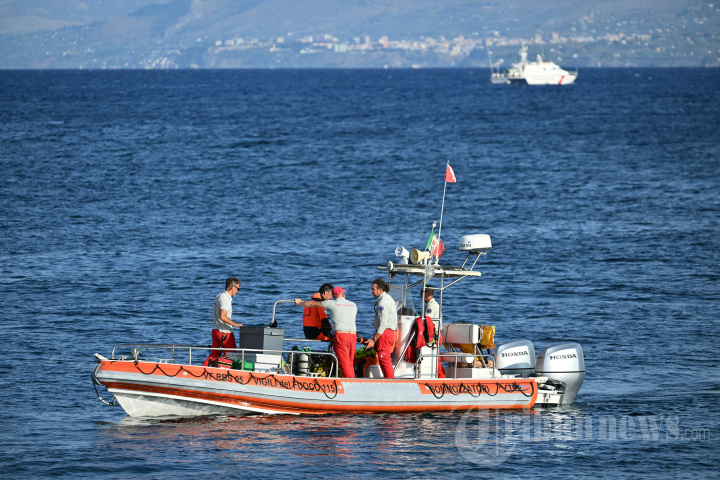 Sebuah kapal penyelamat Vigili del Fuoco, Korps Pemadam Kebakaran Italia, beroperasi di lepas pantai Porticello dekat Palermo, pada tanggal 20 Agustus 2024, sehari setelah kapal pesiar mewah berbendera Inggris, Bayesian, tenggelam. Penyelam spesialis meluncurkan pencarian baru untuk enam orang, termasuk taipan teknologi Inggris Mike Lynch dan ketua Morgan Stanley International, yang hilang sejak kapal pesiar mereka terbalik di lepas pantai pulau Sisilia, Italia. - Bayesian, yang membawa 22 orang termasuk 10 awak kapal, berlabuh sekitar 700 meter dari pelabuhan sebelum fajar ketika dihantam oleh puting beliung, semacam tornado mini. Lima belas orang di dalamnya, termasuk seorang ibu dengan bayi berusia satu tahun, berhasil diselamatkan; satu orang ditemukan tewas; dan enam orang masih hilang. (Photo by Alberto PIZZOLI / AFP)