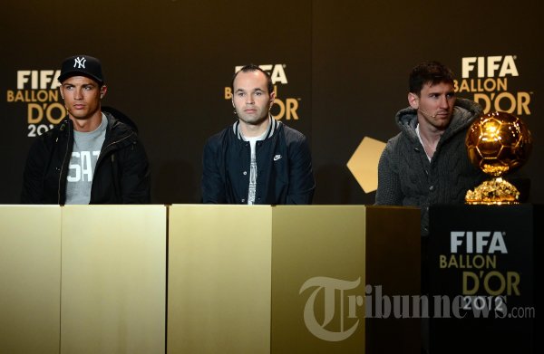 Tiga finalis penghargaan FIFA 2012 Ballon d'Or, Portugal Cristiano Ronaldo (L), Spanyol Andres Iniesta (C) dan Argentina Lionel Messi (R) memberikan konferensi pers di Kongresshaus, di Zurich, Senin (7/1/2013). (AFP PHOTO/OLIVIER MORIN) The three finalists of the Fifa 2012 Ballon d'Or award, Portugal's Cristiano Ronaldo (L) , Spain's Andres Iniesta (C) and Argentina's Lionel Messi (R) give a press conference nex to the Ballon d'Or trophy on January 7, 2013 at the Kongresshaus, ahead of the award ceremony in Zurich. AFP PHOTO / OLIVIER MORIN